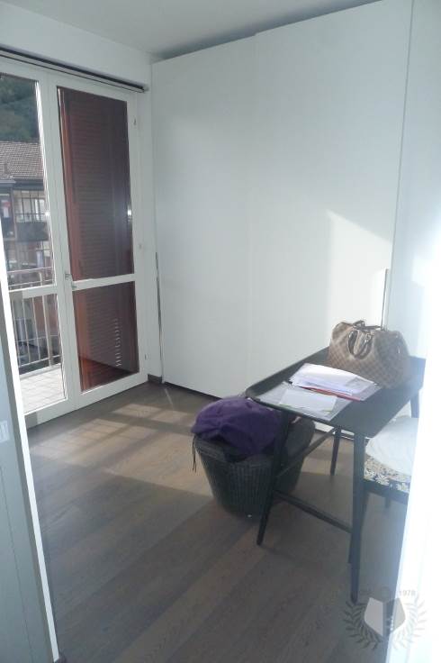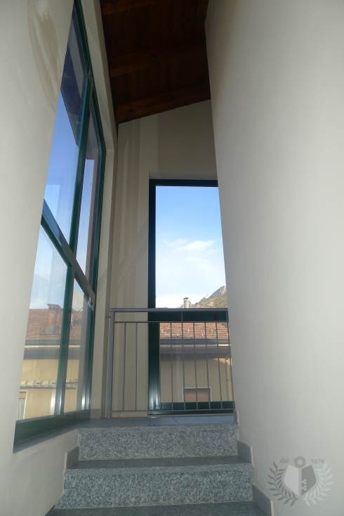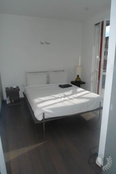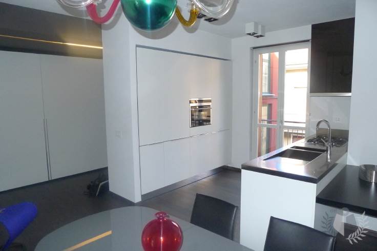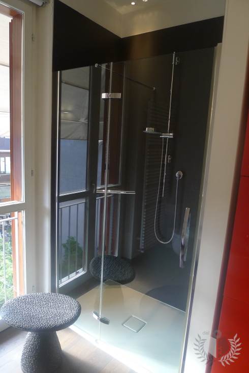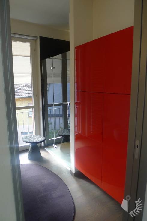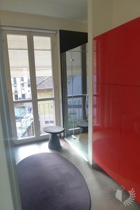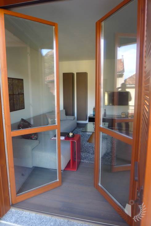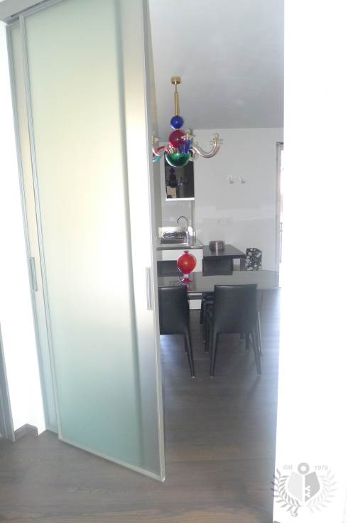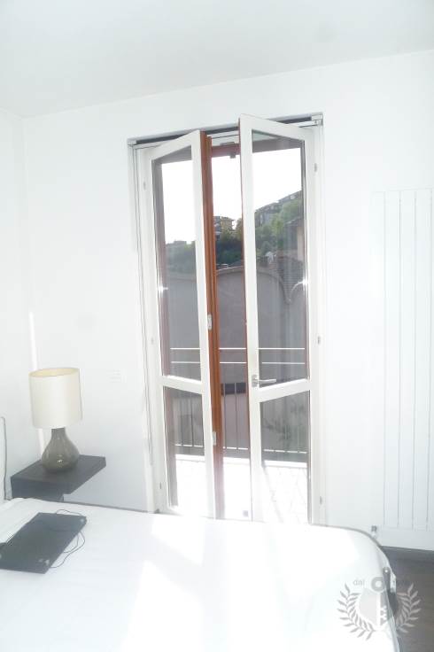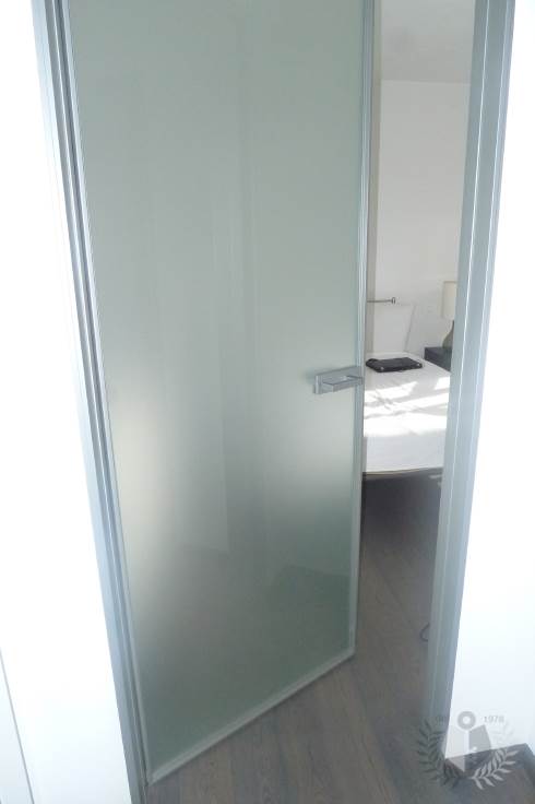 Les sols sont en parquet et carrelage, les fenêtres en bois et les portes intérieures en verre dépoli (Rimadesio).